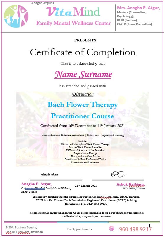 Bach Flower Remedies Another very in depth program on becoming Bach Flower Practitioner. Completely self paced with contact sessions at regular intervals. Details about Bach remedies system, their application and case studies