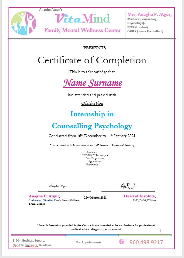 3 months intensive internship program, in joint venture with B.Karve Institute, Pune. Take your knowledge to next level. Detailed field work, gain experience with expert counsellors
